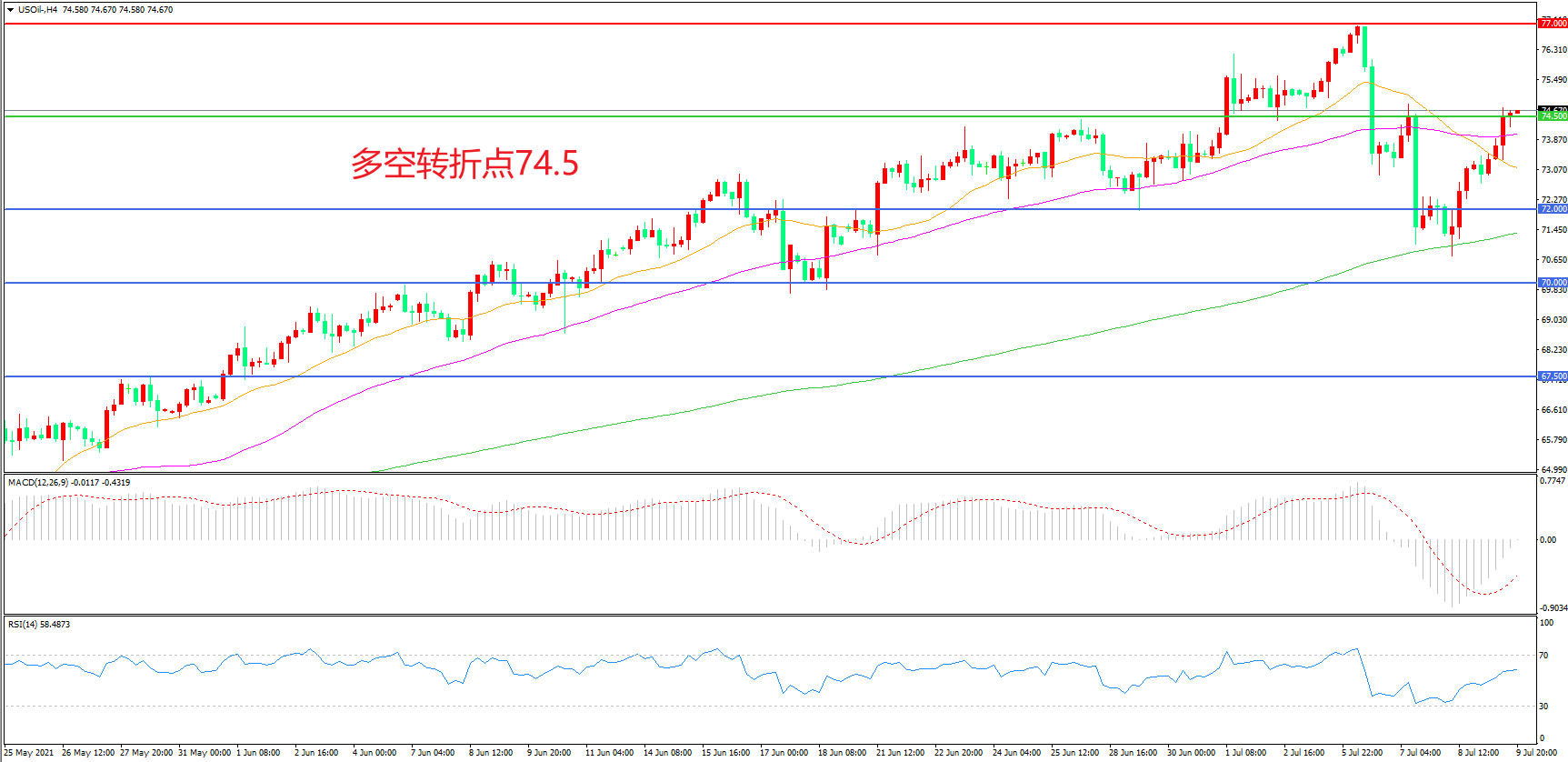 上周,原油价格经历了“大喜大悲”,多空双方在也在经历着痛苦的煎熬,OPEC+未能达成协议,还取消了召开会议的计划,已经有投资者担心,僵局再持续下去会爆发价格战,市场基本面的强势和阿联酋的利空交织在一起,原油市场的波动率在逐渐增加,美国WTI原油震荡反弹,收报74.67美元/桶。现在市场还没有确定下一次OPEC会议的具体时间,因此这一风险事件也就一直萦绕在市场上方,如果市场的担忧情绪依然会比较浓,油价会继续维持在高波动率的状态。