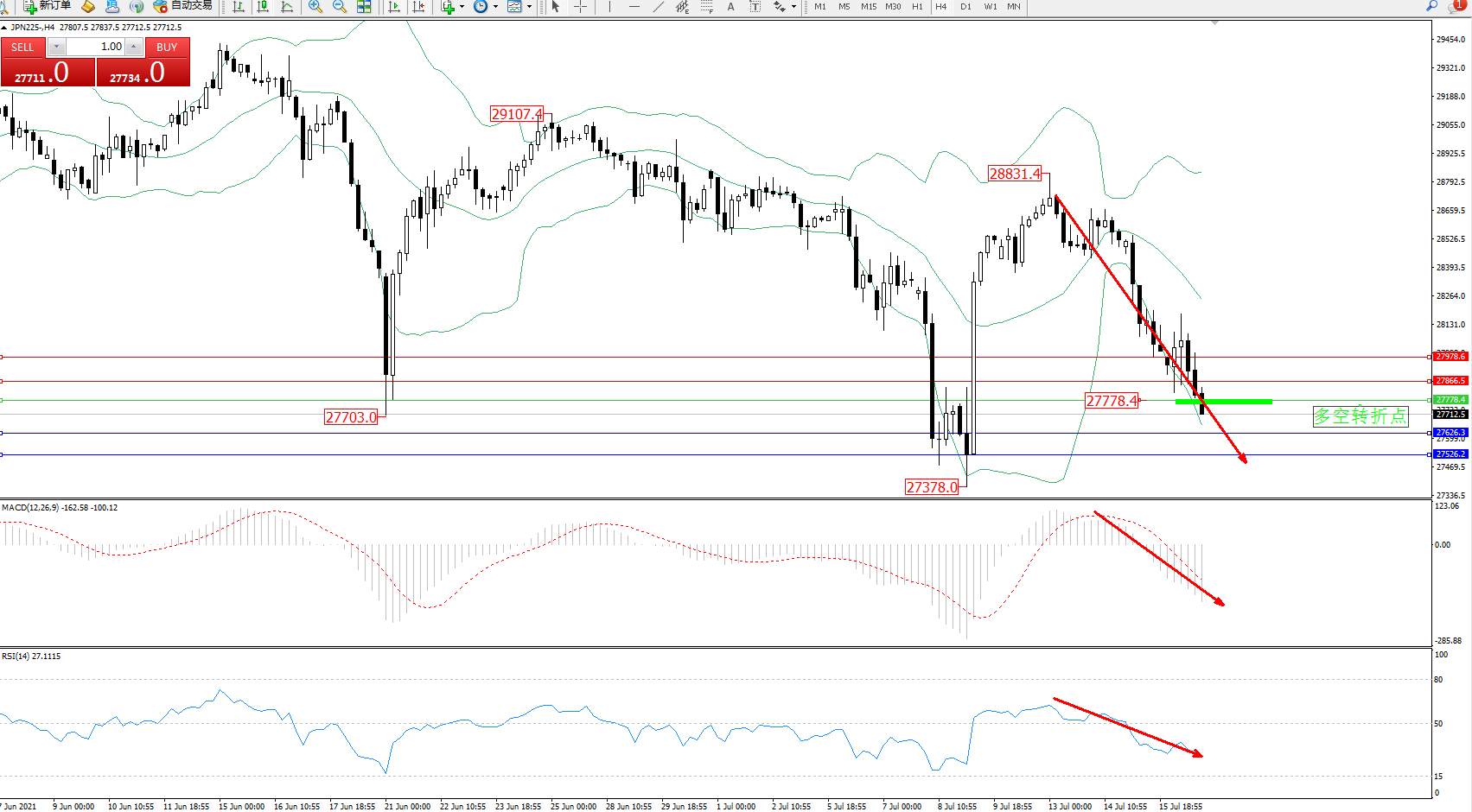 日经225指数7月16日(周五)收盘下跌278.09点,跌幅0.98%,报28001.00点。日本央行行长黑田东彦:日本经济正在恢复。服务业支出疲软导致消费停滞。海外经济整体处于复苏当中。日本经济活动将暂时维持在低位,但随着疫苗接种的进行,经济活动将出现复苏。消费者通胀暂时维持在0%左右,然后将逐步加速。