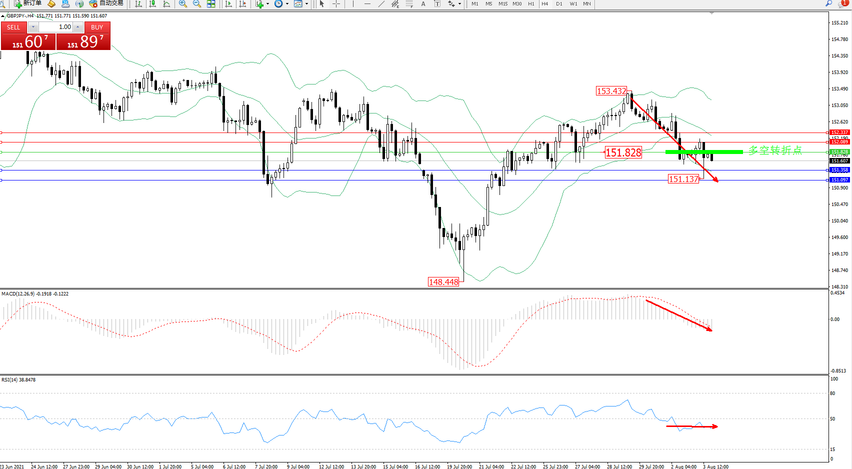 交易策略:151.828下方看跌,目标151.358、151.097
