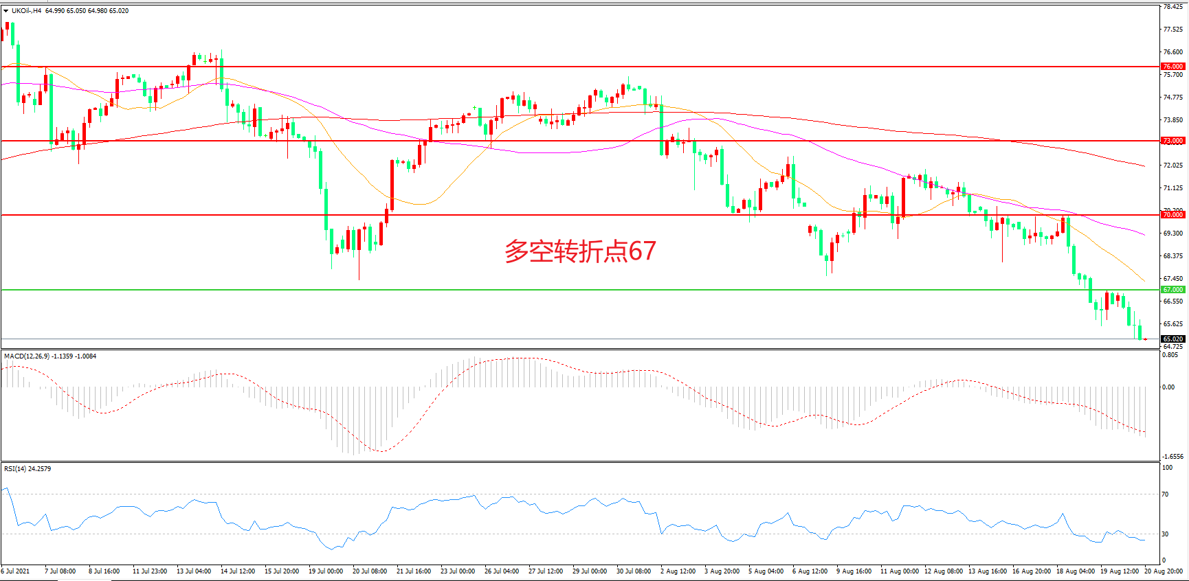 4小时图看,油价整体低开低走,表现极度低迷,均线系统呈空头排列,67美元成为短期阻力,MACD绿柱增加,RSI指标走平,油价震荡下行概率较大。