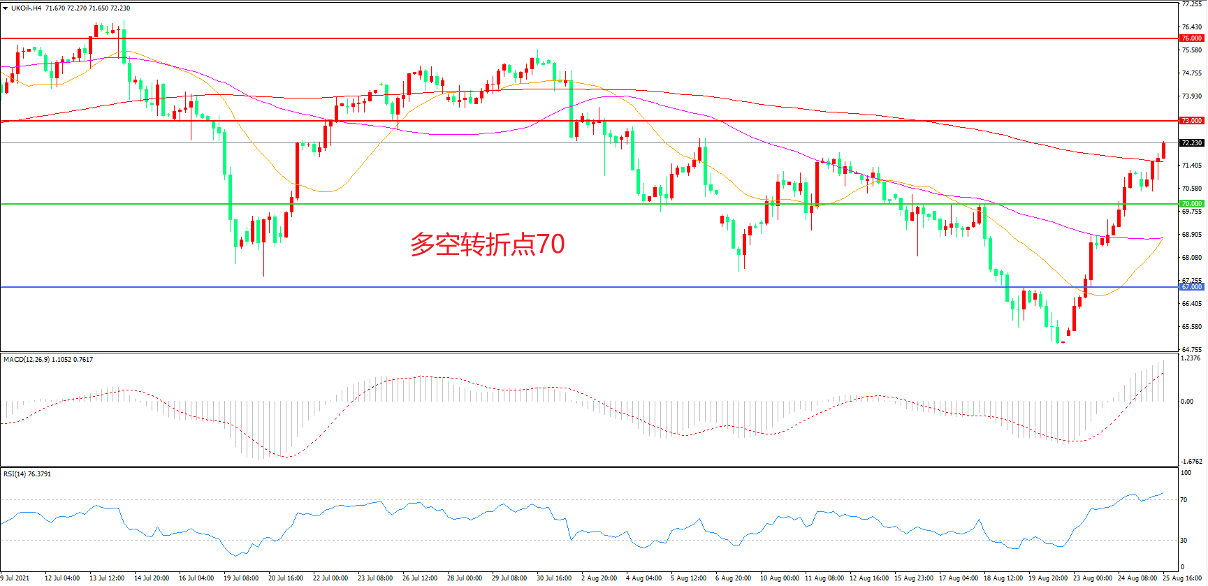 4小时图看,油价阳线连续拉升,短期走势偏强, 55周期均线被突破,73美元成为上方阻力,MACD红柱增加,RSI指标走平,日内延续震荡概率较大。