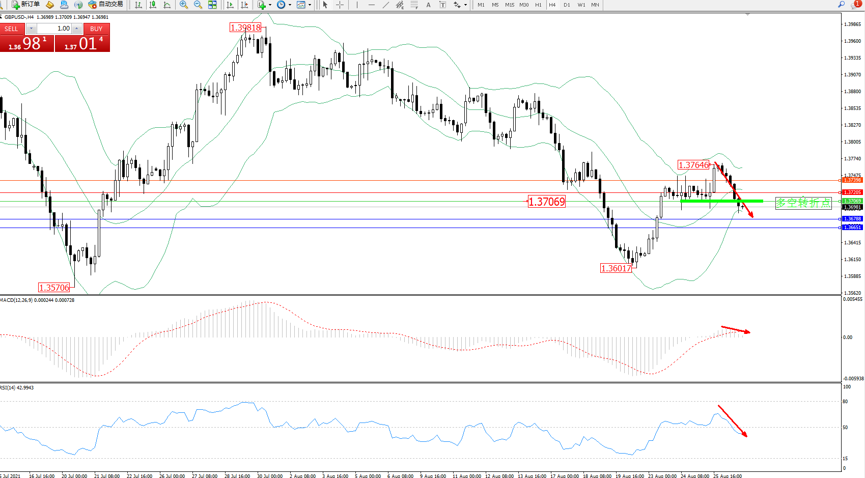 交易策略:1.37069下方看跌,目标1.36788、1.36651