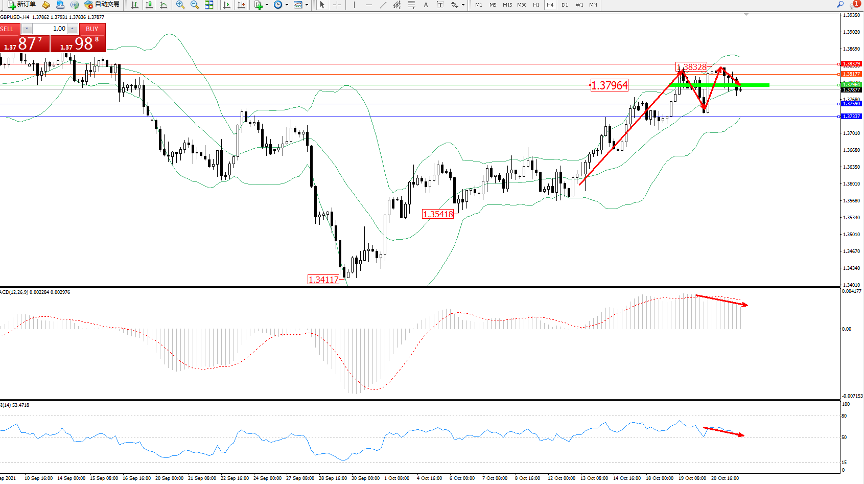 交易策略:1.37964下方看跌,目标1.37590、1.37337