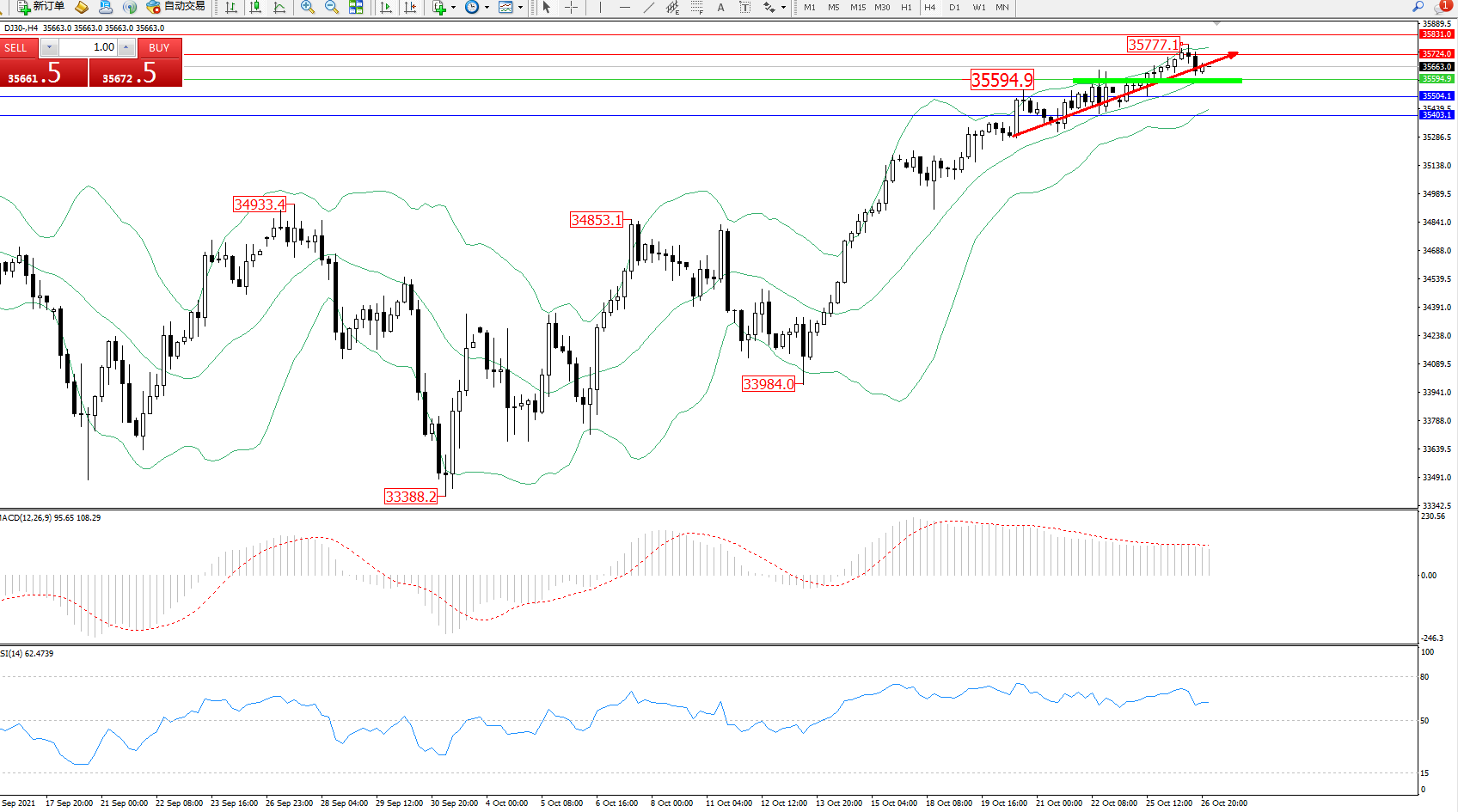 道琼斯指数DJ30——4小时K线图显示: