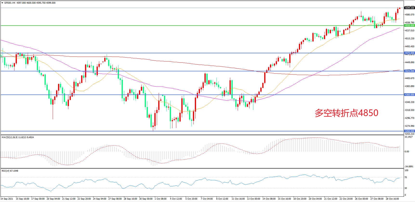 4小时图看,标普500回踩4550支撑后再度拉升,短期表现偏强,均线系统呈多头排列,MACD红柱增加,RSI指标走平,日内延续上行概率较大。