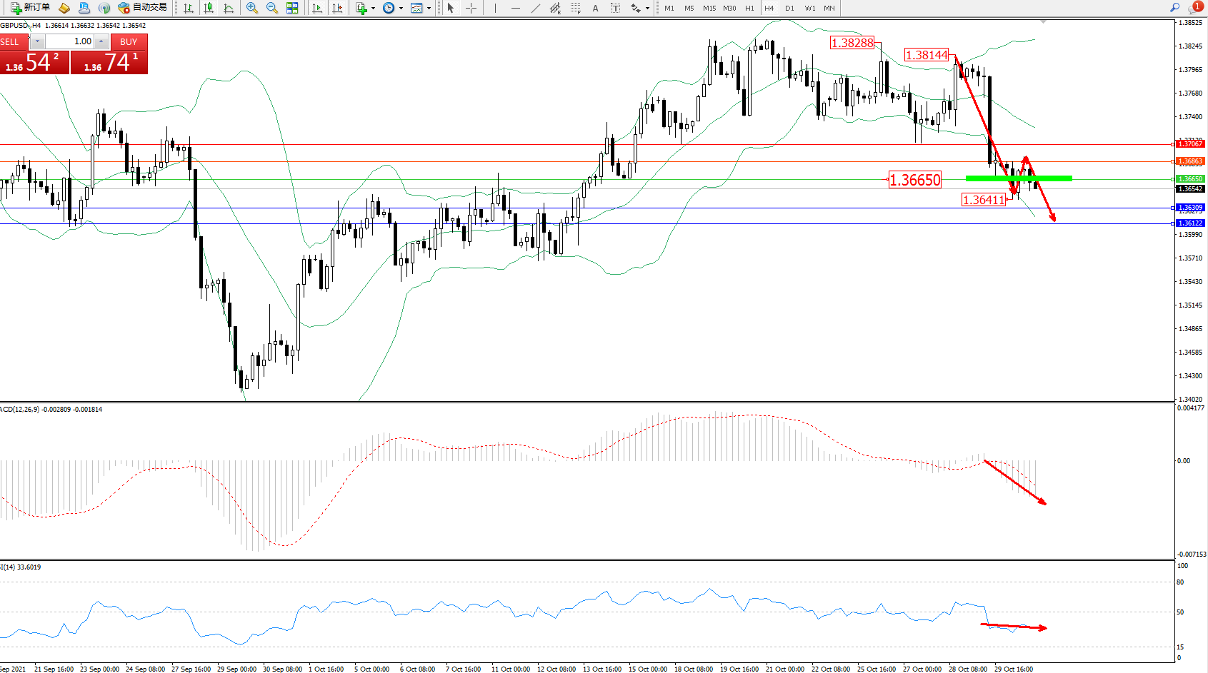 交易策略:1.36650下方看跌,目标1.36309、1.36122