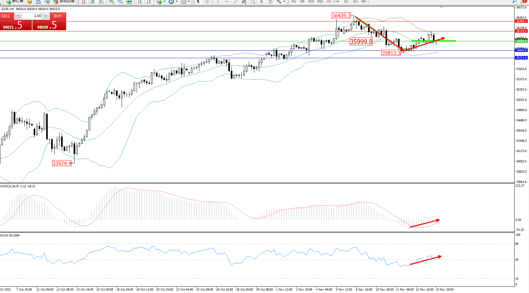 道琼斯指数DJ30——4小时K线图显示: