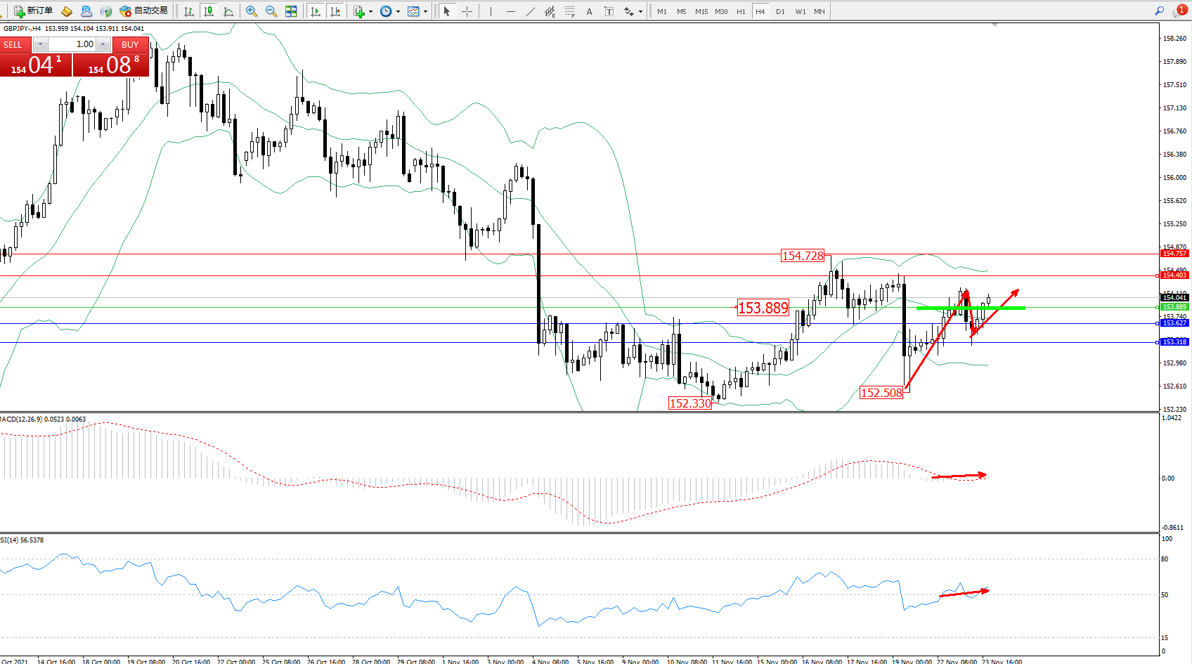 交易策略:153.889上方看涨,目标154.403、154.757
