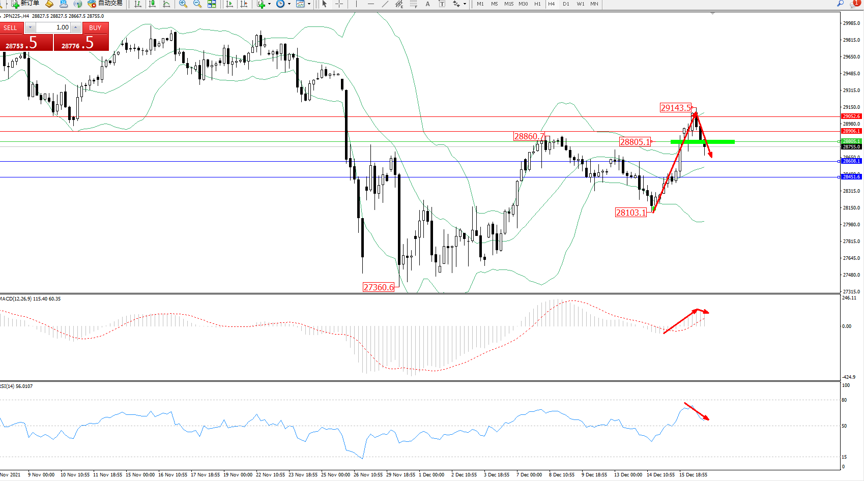 日经指数JPN225——4小时K线图显示: