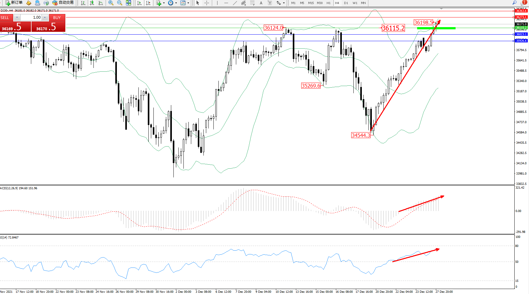 道琼斯指数DJ30——4小时K线图显示: