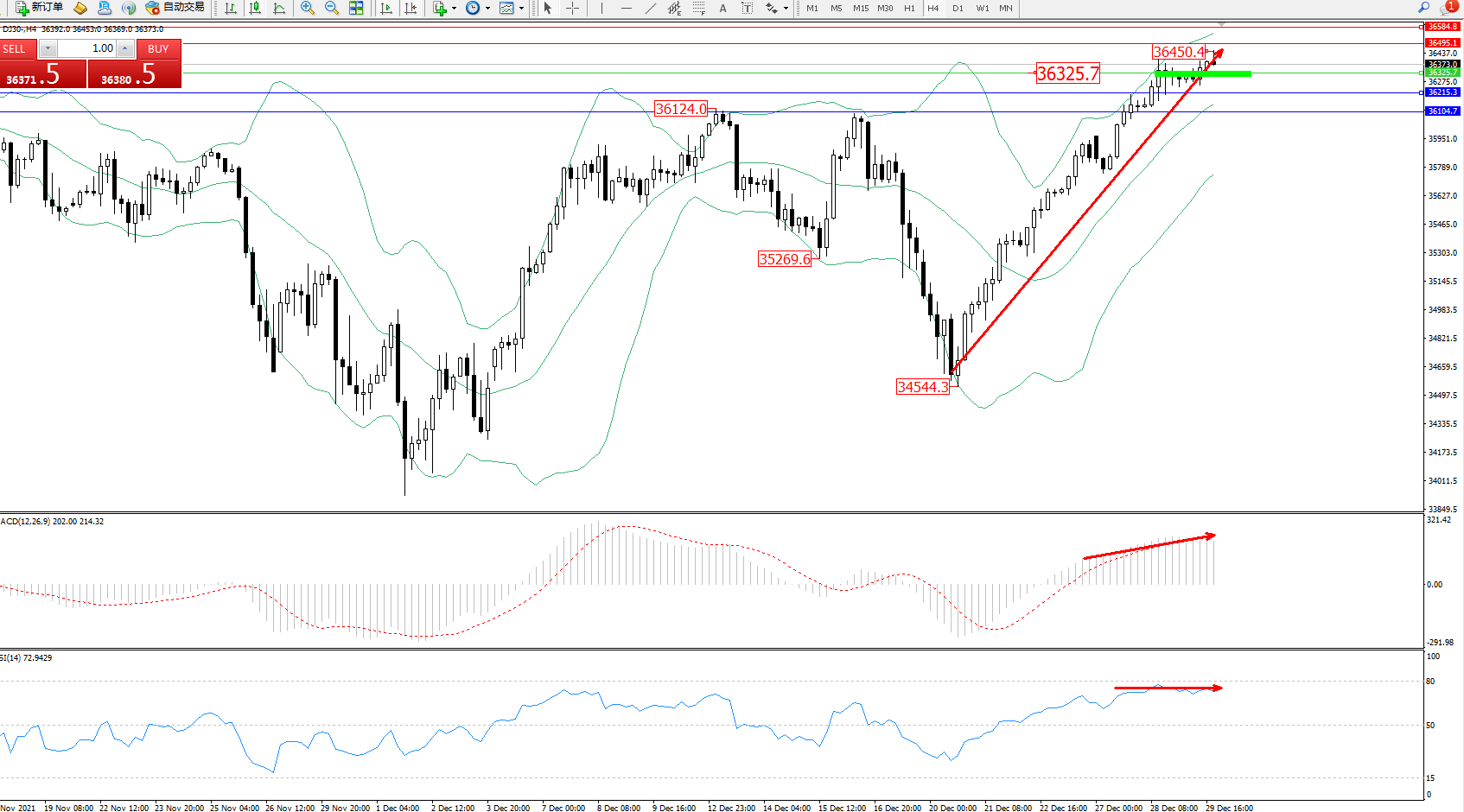 道琼斯指数DJ30——4小时K线图显示: