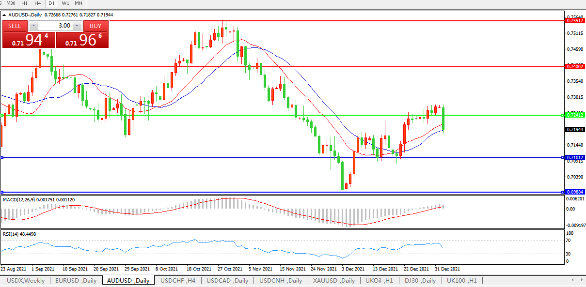 交易策略:0.7240下方看跌,目标0.7100、0.6980