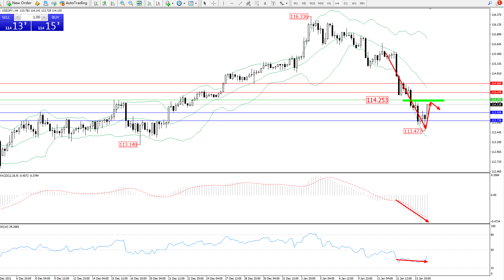 交易策略:114.253下方看跌,目标113.936、113.736