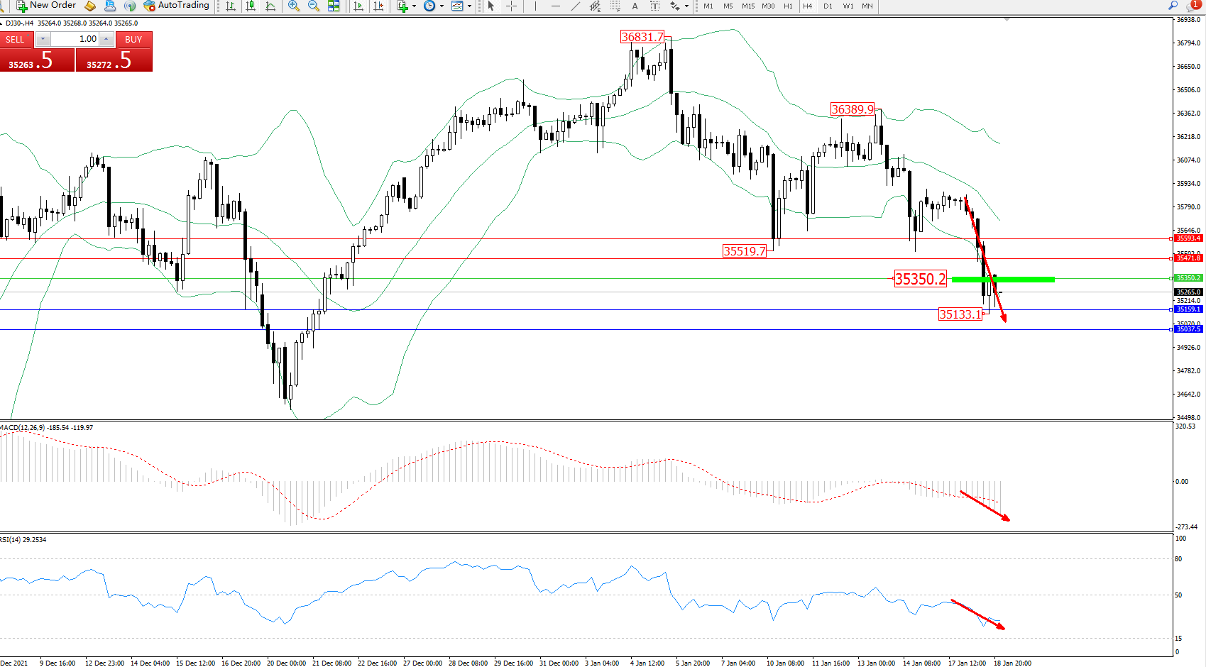 道琼斯指数DJ30——4小时K线图显示:
