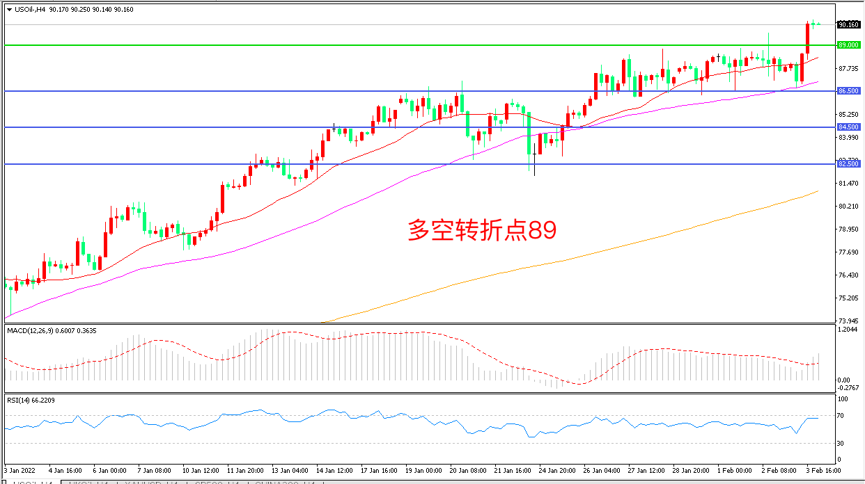 4小时图看,油价长阳拉升,短期走势偏强,89美元成为下方支撑,92美元成为下一目标,MACD红柱增加,RSI指标走平,日内震荡上行概率较大。