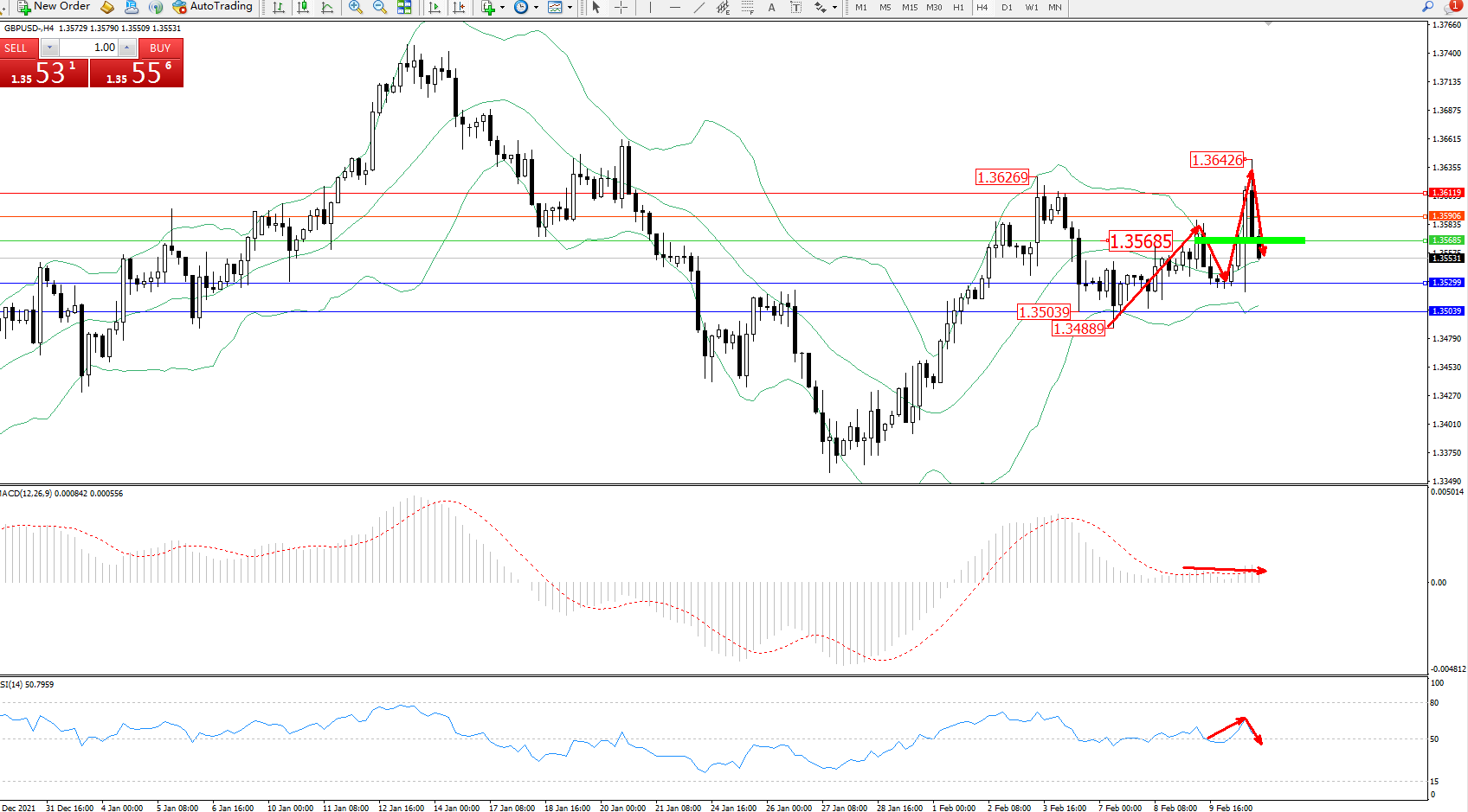 交易策略:1.35685下方看跌,目标1.35299、1.35039