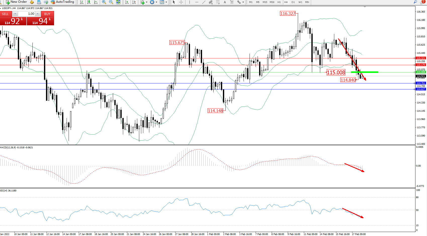 交易策略:115.008下方看跌,目标114.761、114.627