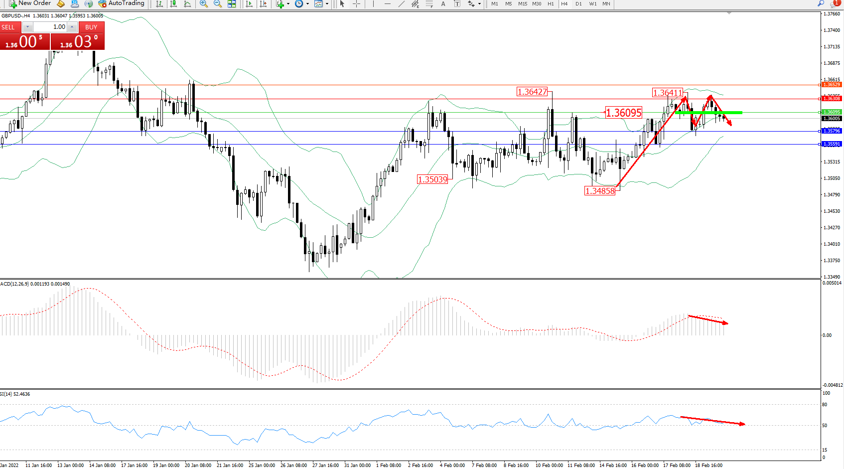 交易策略:1.36095下方看跌,目标1.35796、1.35591