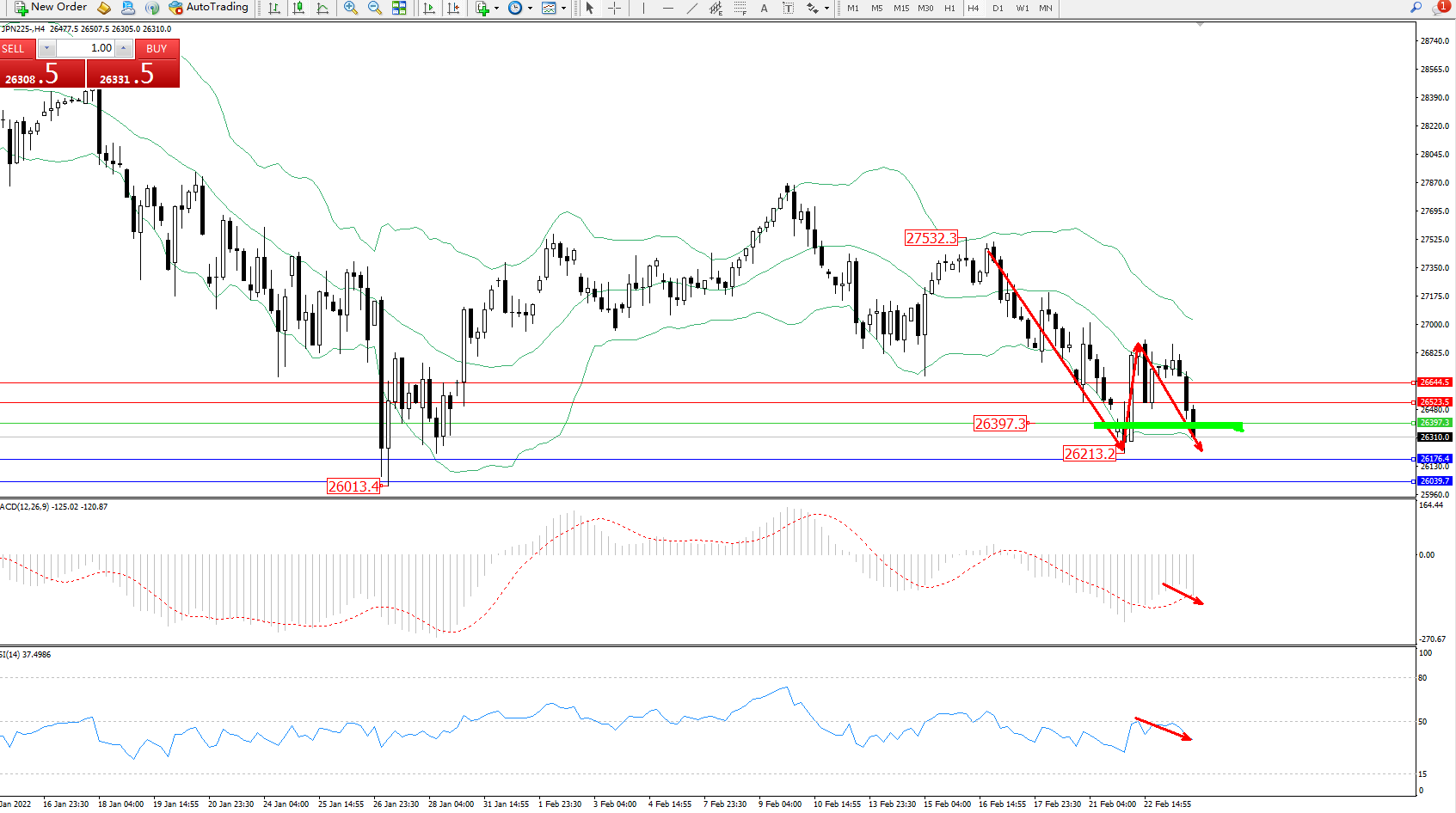 日经指数JPN225——4小时K线图显示: