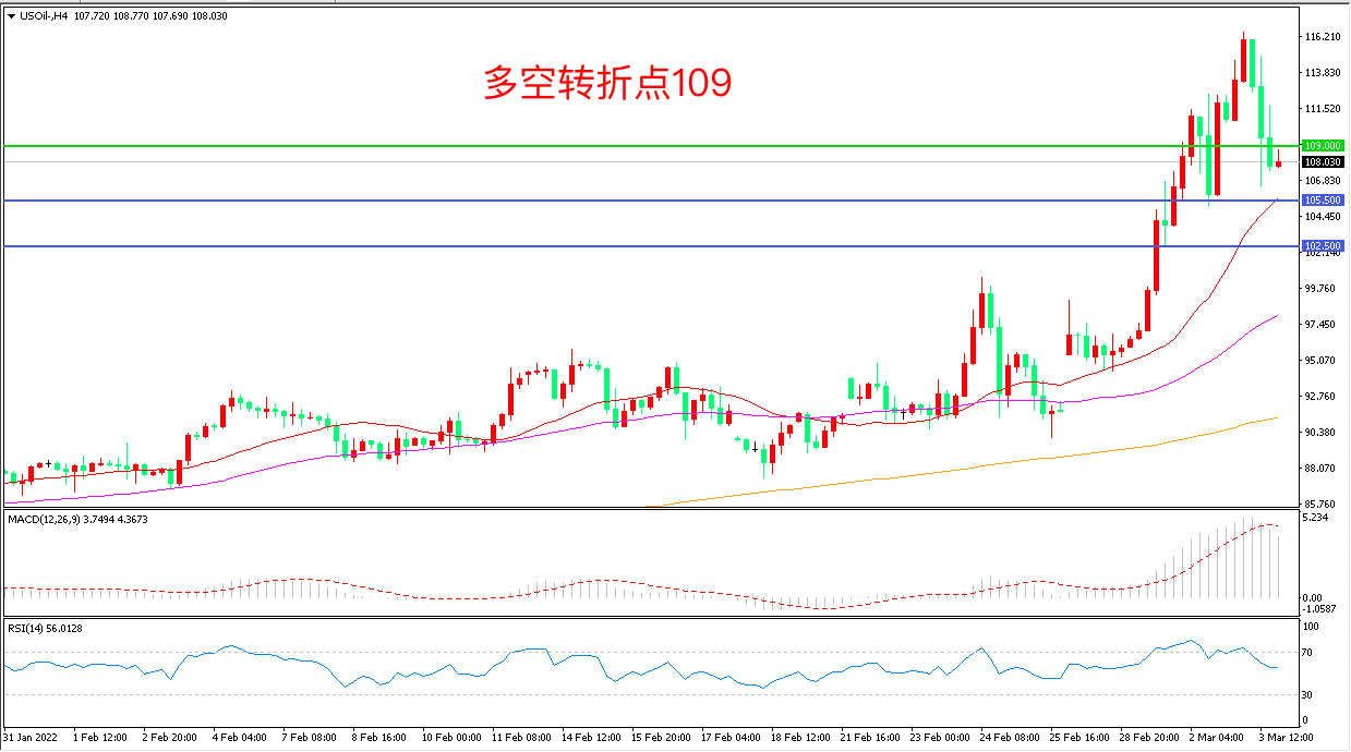 周四(3月3日),市场有消息传出伊核协议可能于未来72小时内签署,多头情绪受到影响,美国WTI原油大幅回落,收报109.00美元/桶。近期由于担心俄罗斯能源出口成为制裁目标,油价一路高歌猛进,而贸易中断和航运问题引发供应担忧的同时,美国原油库存也跌至多年低点,如果俄乌冲突再度升级,可能再度对油价形成支撑。