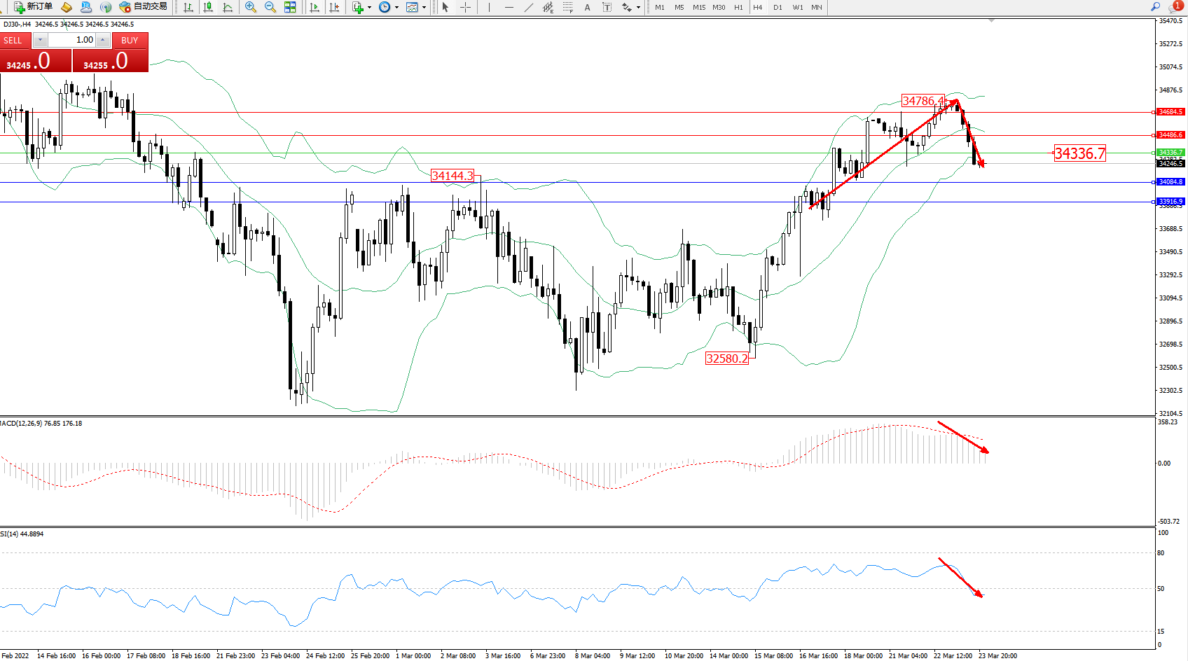 道琼斯指数DJ30——4小时K线图显示: