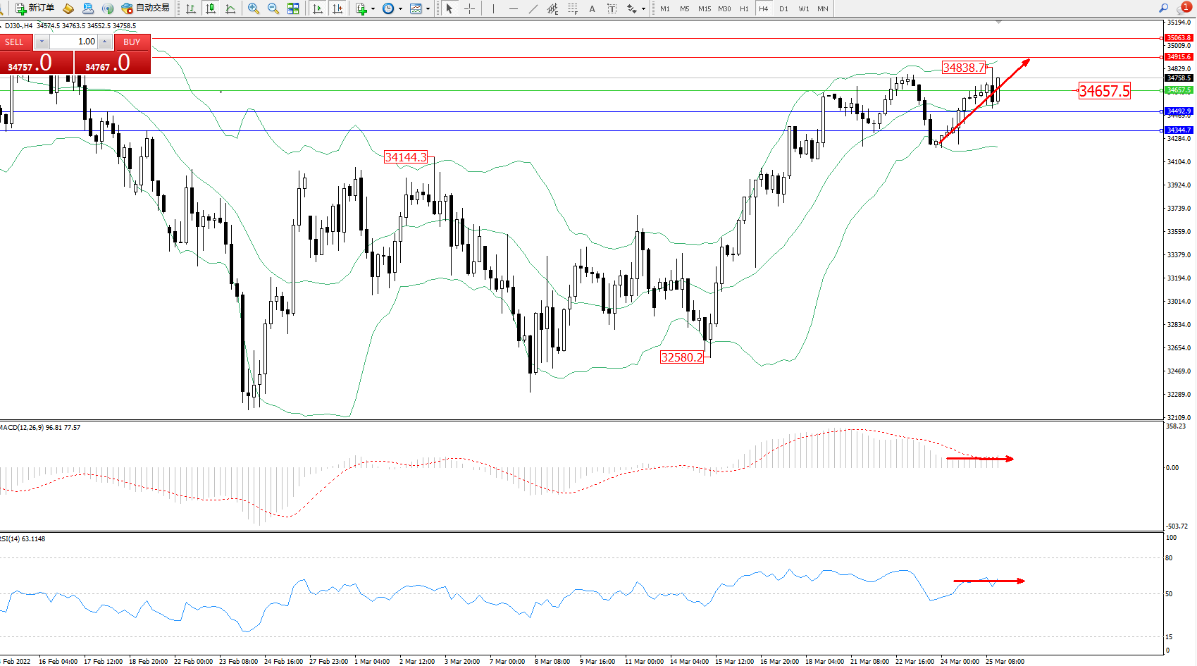 道琼斯指数DJ30——4小时K线图显示: