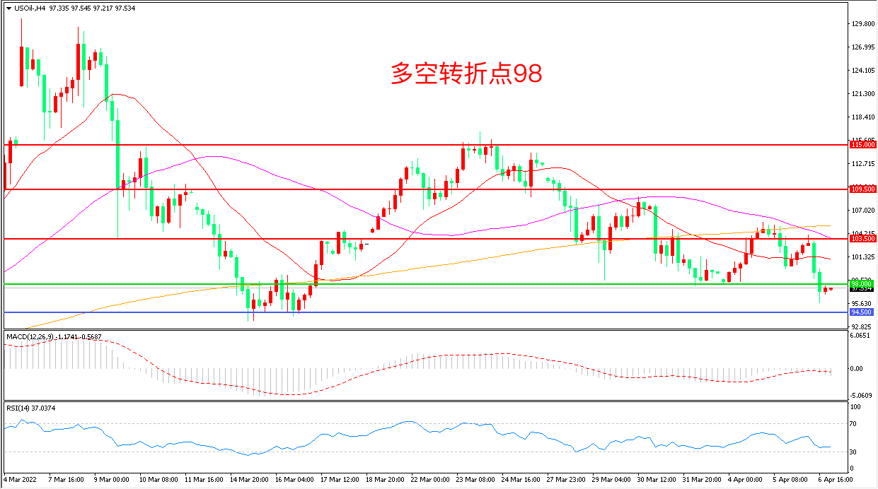 周三(4月6日),在美国宣布大举抛售战略原油储备后,周三据华尔街日报报道,国际能源署(IEA)的成员国们,正计划从他们的储备中再释放近6000万桶石油,美国WTI原油大幅回落,收报97.50美元/桶。此外,昨晚公布的EIA数据也对油价构成抑制,数据显示,美国原油产量连续第二周上升,回到2020年5月以来的最高水平,多重利空因素的袭击下,油价面临巨大压力。