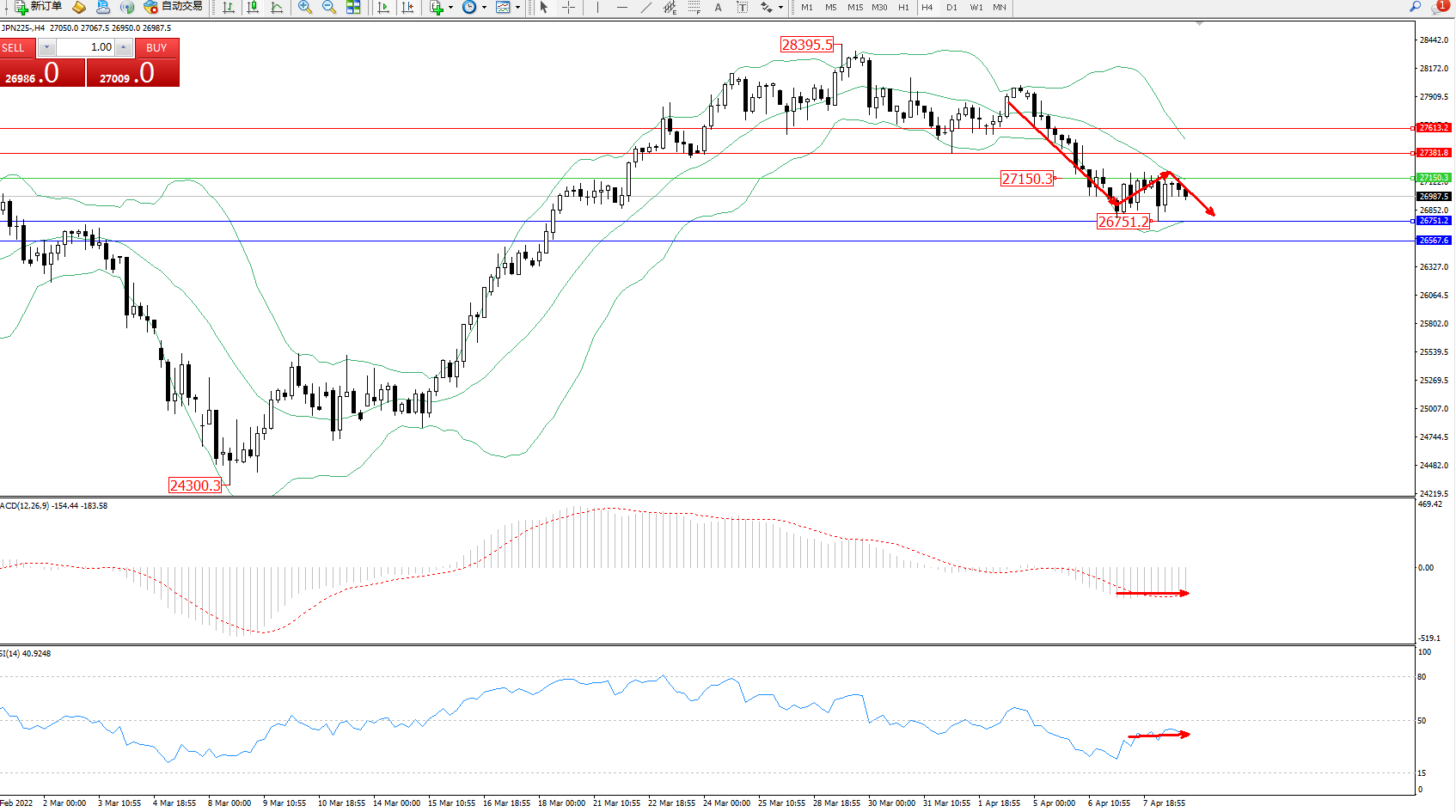 日经指数JPN225——4小时K线图显示: