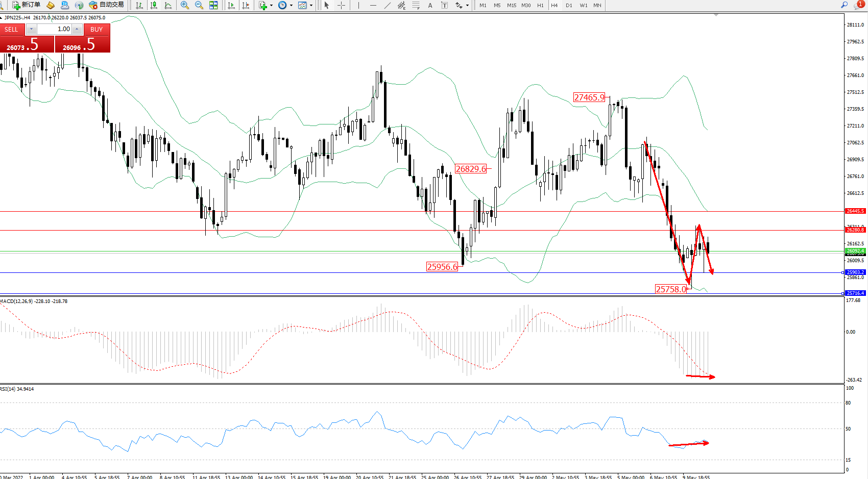 日经指数JPN225——4小时K线图显示: