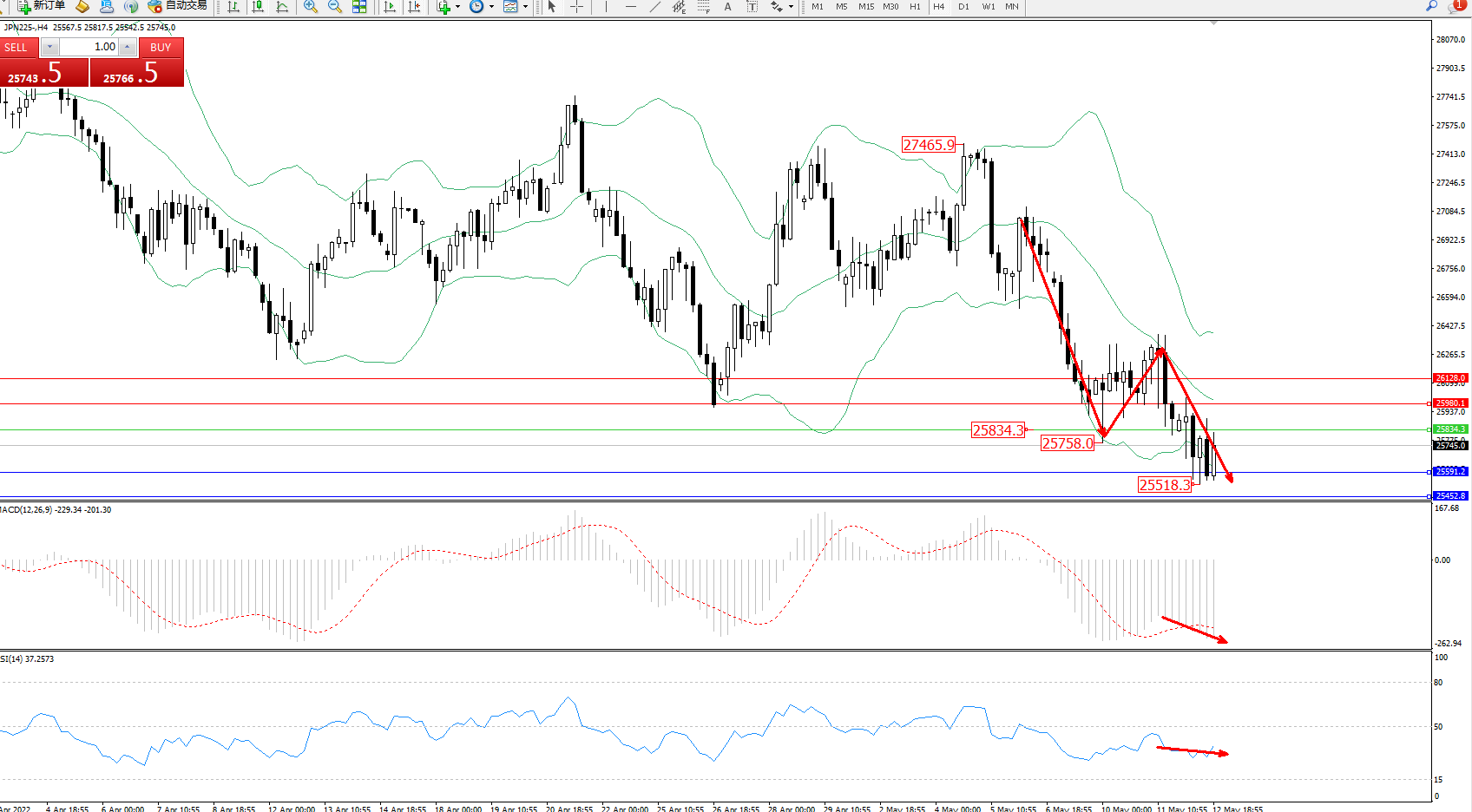 日经指数JPN225——4小时K线图显示: