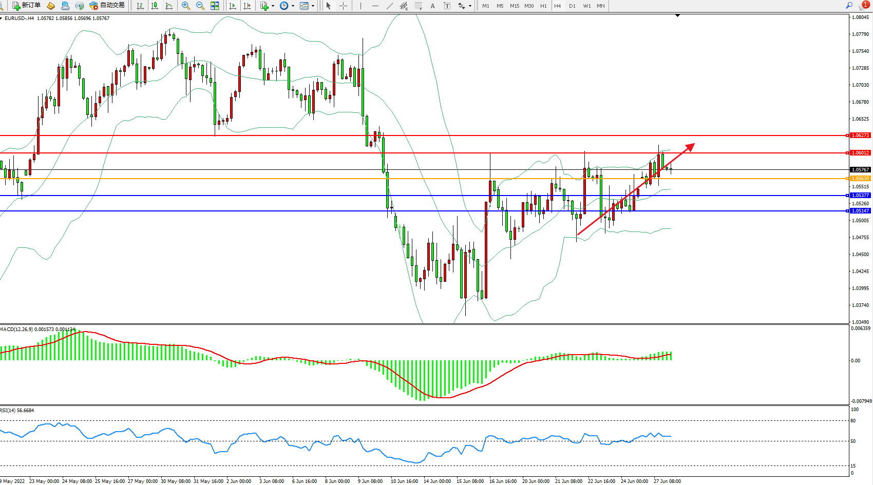 交易策略:1.05774上方看涨,目标1.06012、1.06273