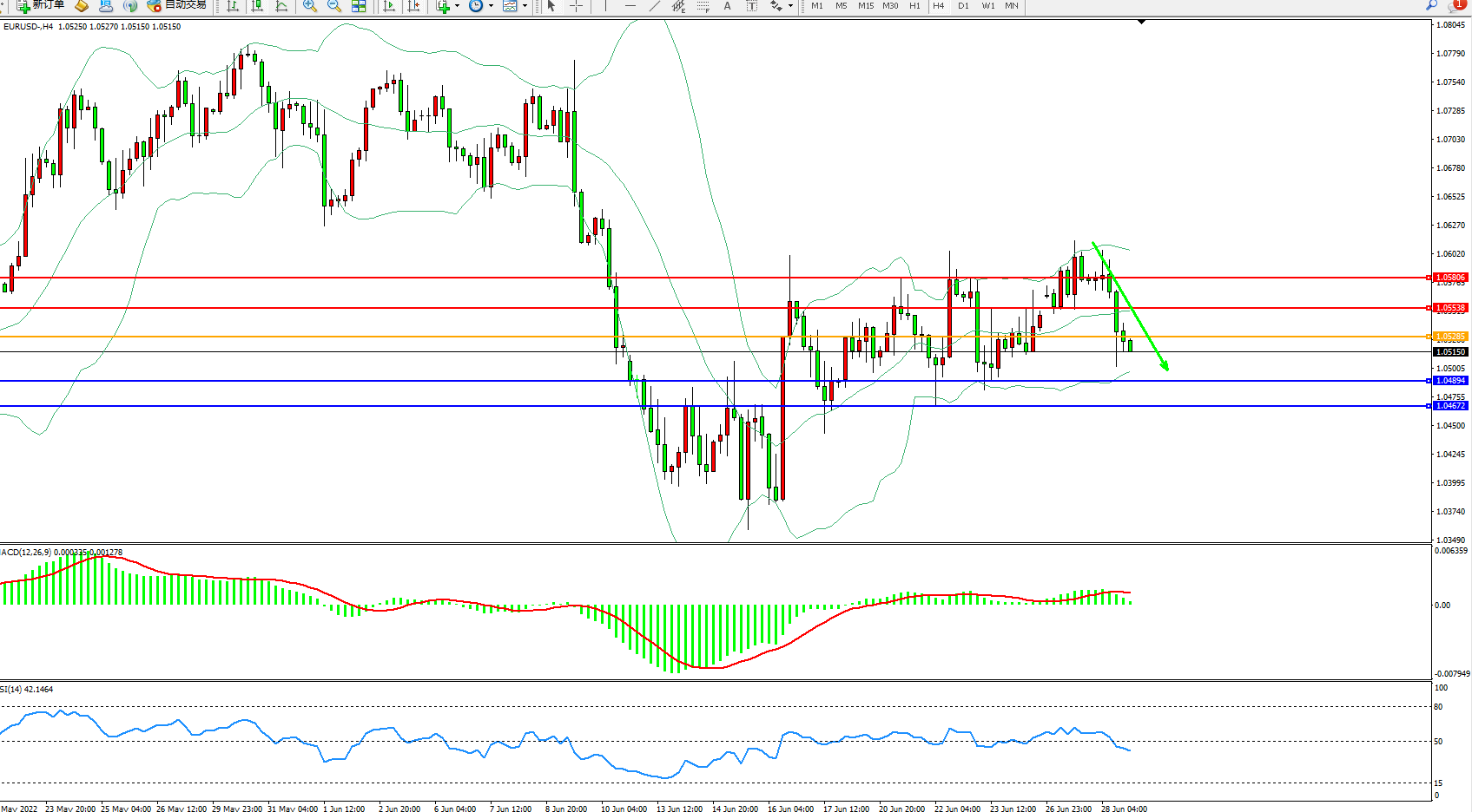欧元美元EURUSD—4小时K线图显示: