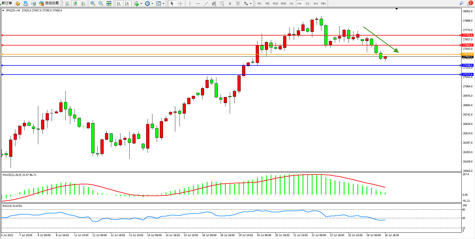 日经指数JPN225——4小时K线图显示: