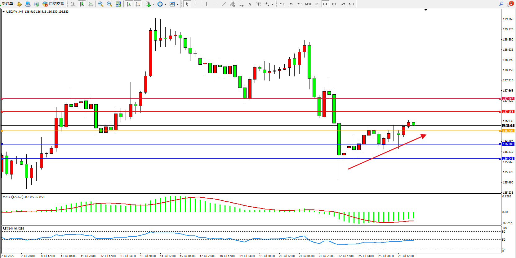 交易策略:136.704上方看涨,目标137.159、137.467