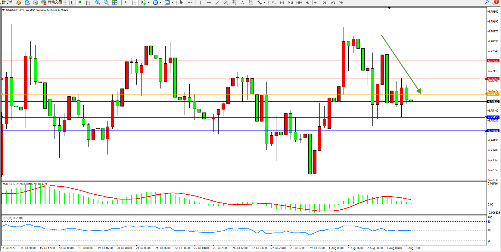 交易策略:6.76129下方看跌,目标6.75155、6.74589