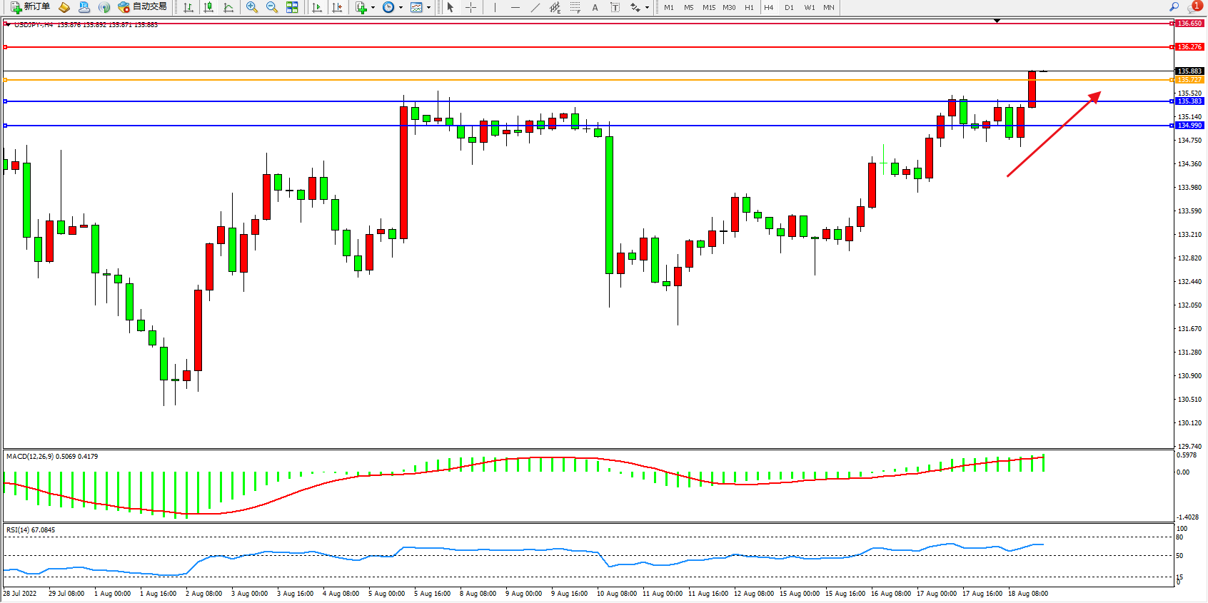交易策略:135.727上方看涨,目标136.276、136.650