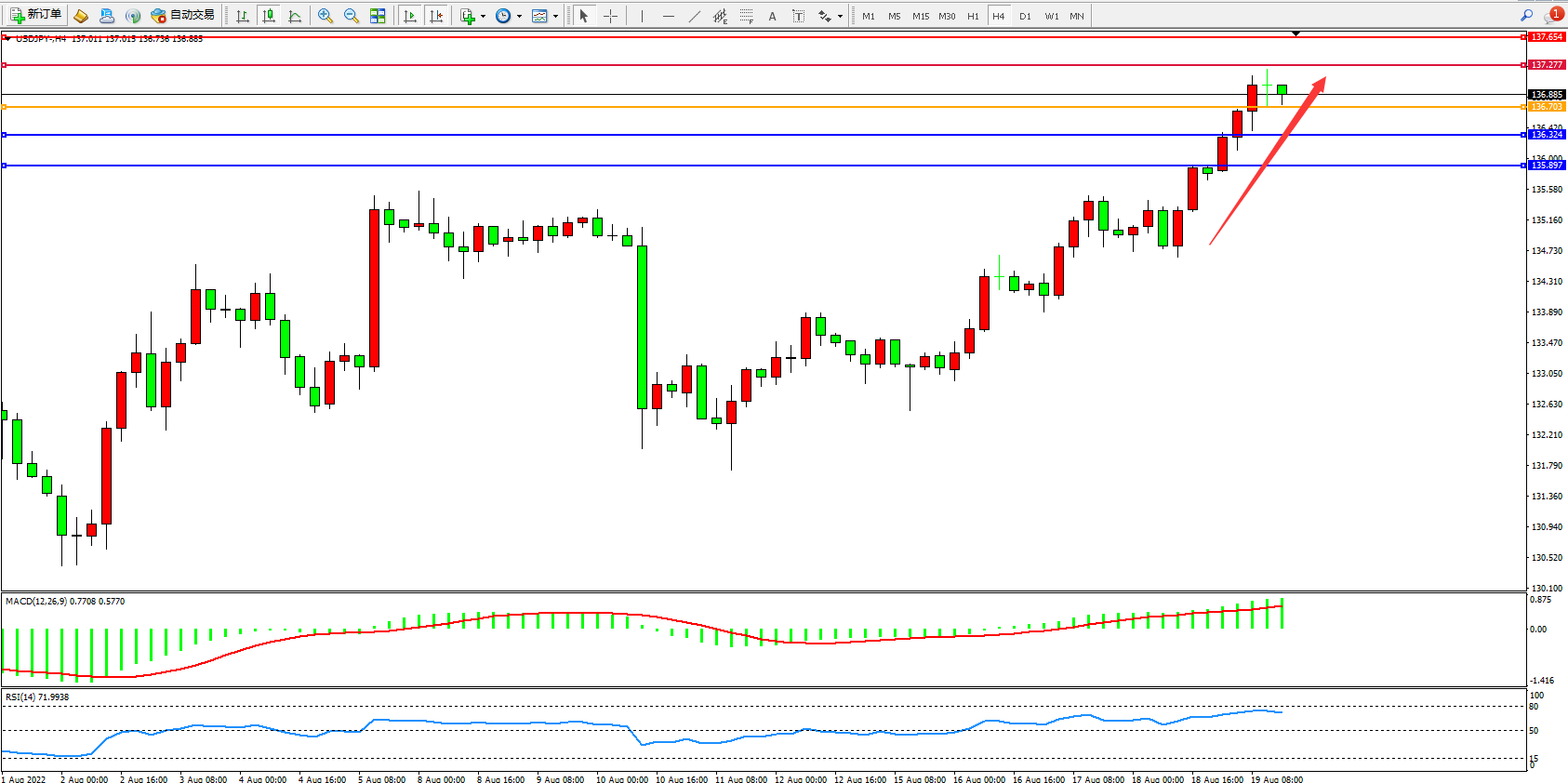 交易策略:136.703上方看涨,目标137.277、137.654