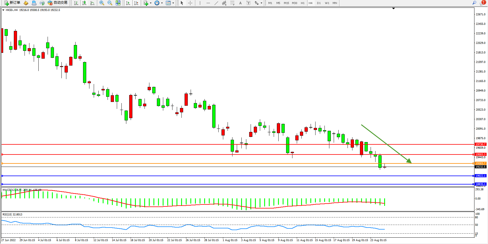 恒指:空头持续弱势下挫 CHINA300  HK50