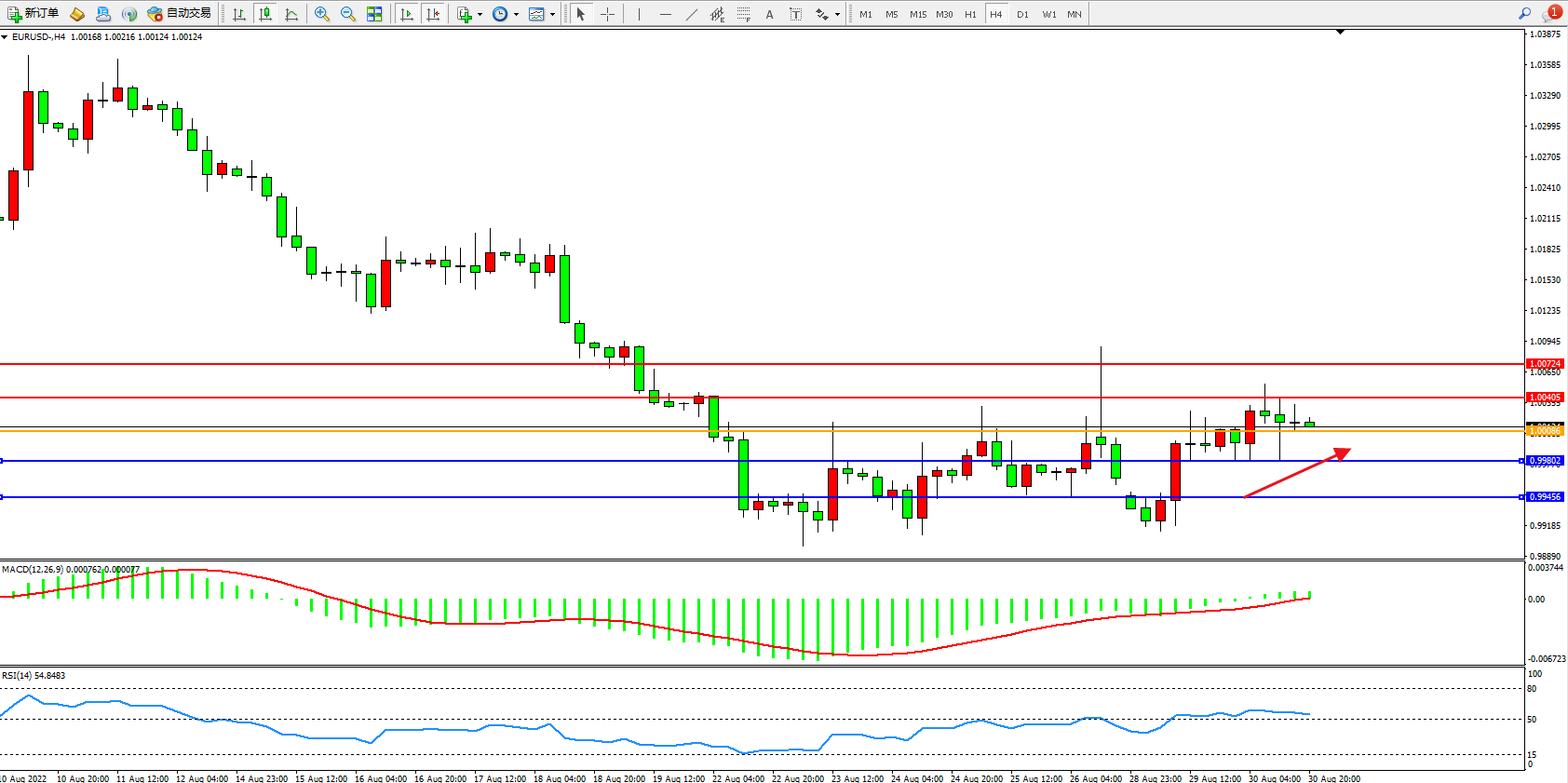 欧元美元EURUSD—4小时K线图显示: