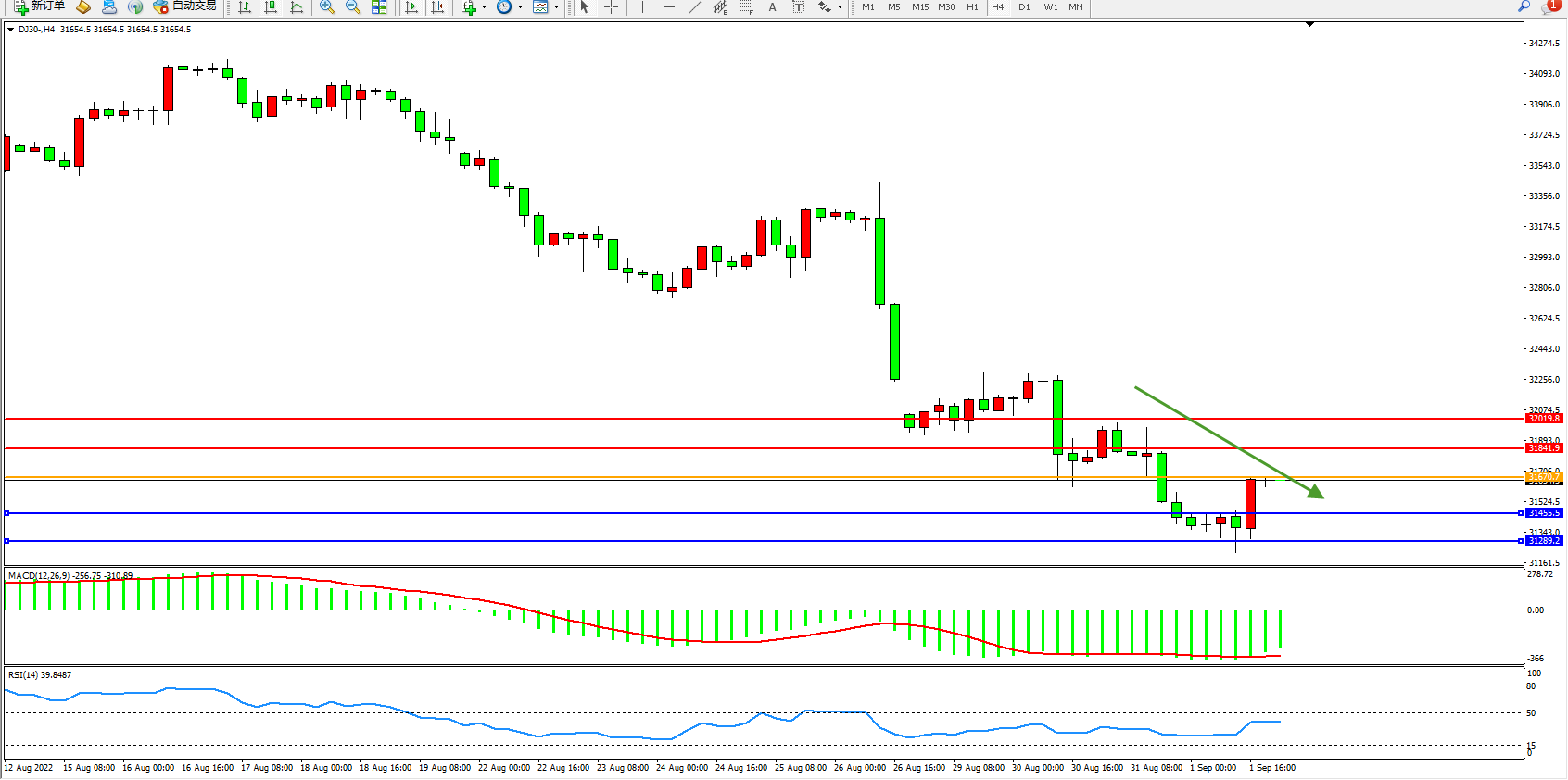 道琼斯指数DJ30——4小时K线图显示: