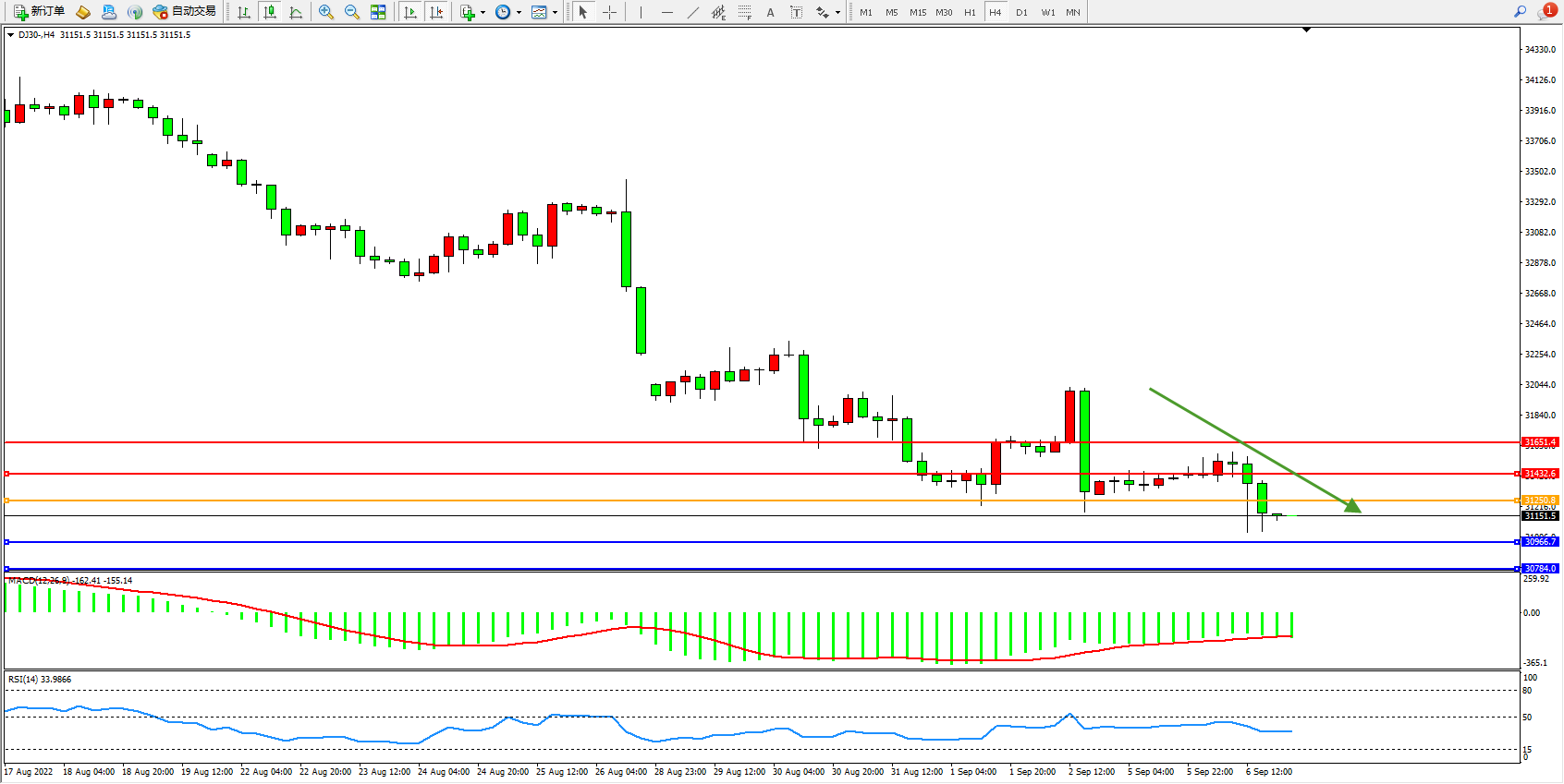 道琼斯指数DJ30——4小时K线图显示: