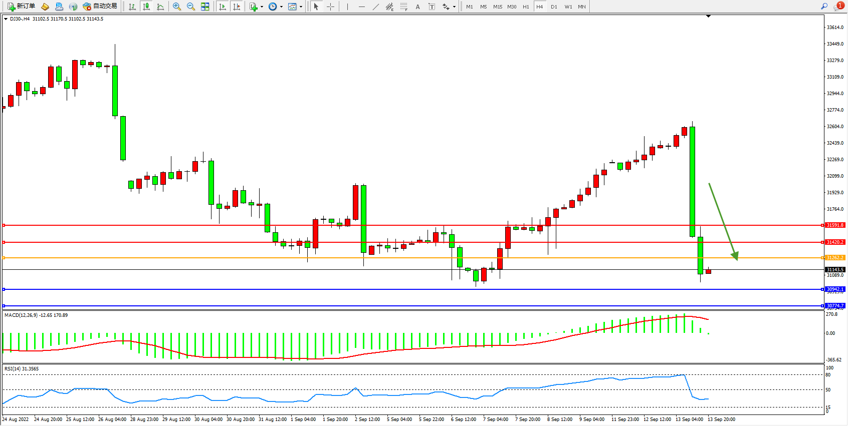 道琼斯指数DJ30——4小时K线图显示:
