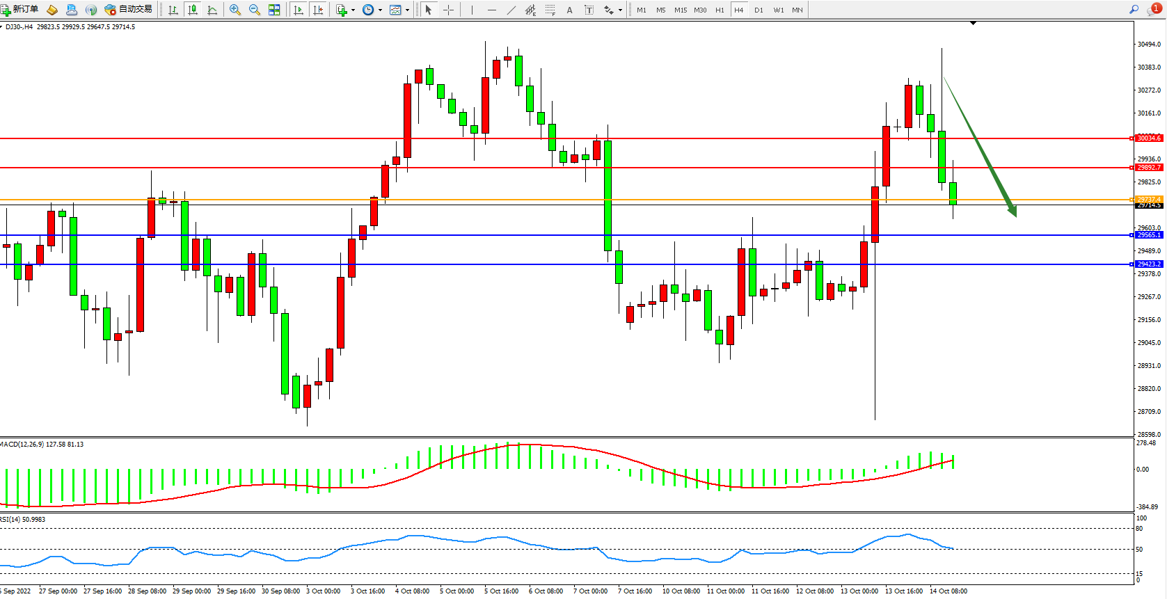 道琼斯指数DJ30——4小时K线图显示: