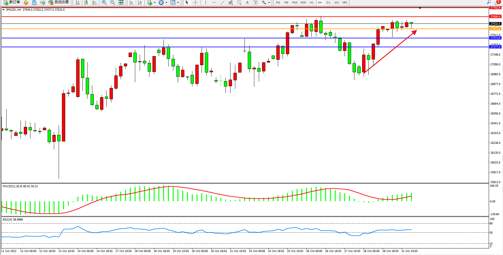 日经指数JPN225——4小时K线图显示: