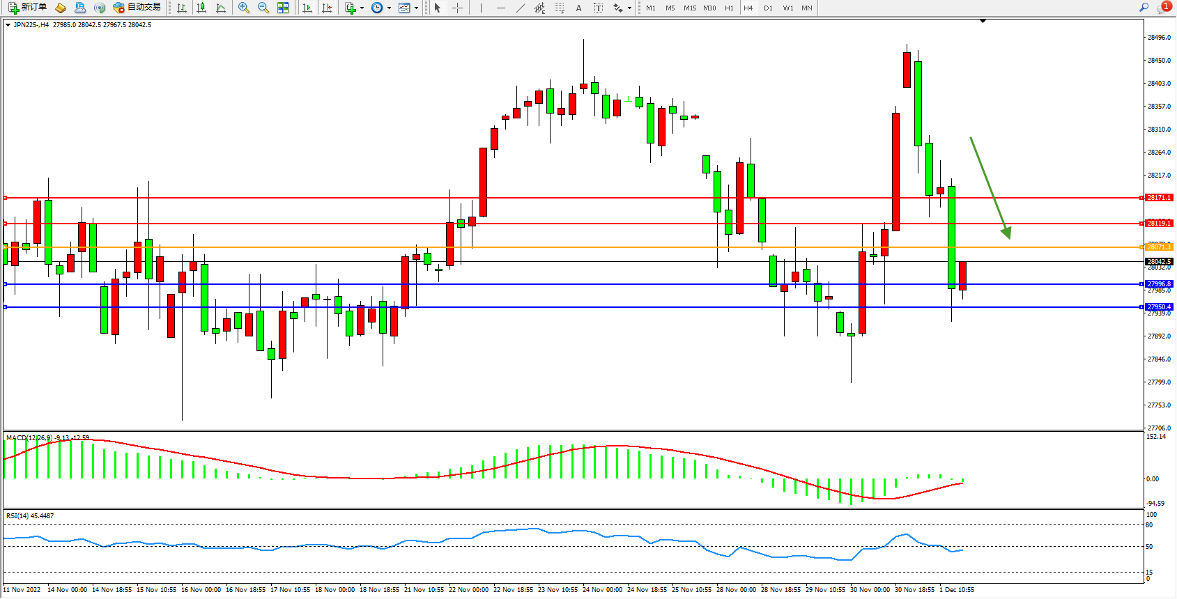 日经指数JPN225——4小时K线图显示:
