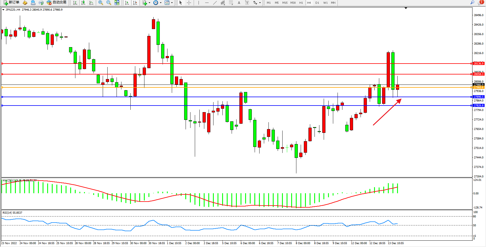 日经指数JPN225——4小时K线图显示: