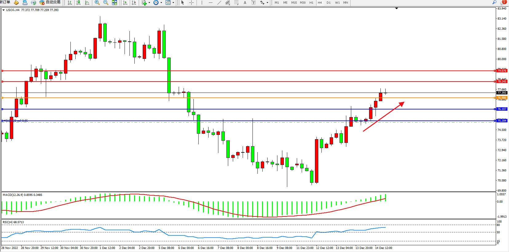 交易策略:76.986上方看涨,目标78.245、79.076