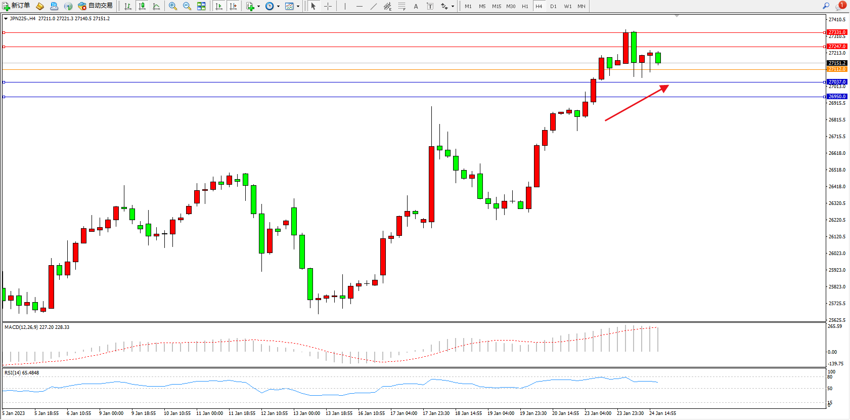 日经指数JPN225——4小时K线图显示: