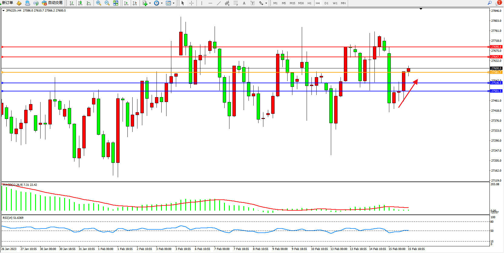日经指数JPN225——4小时K线图显示: