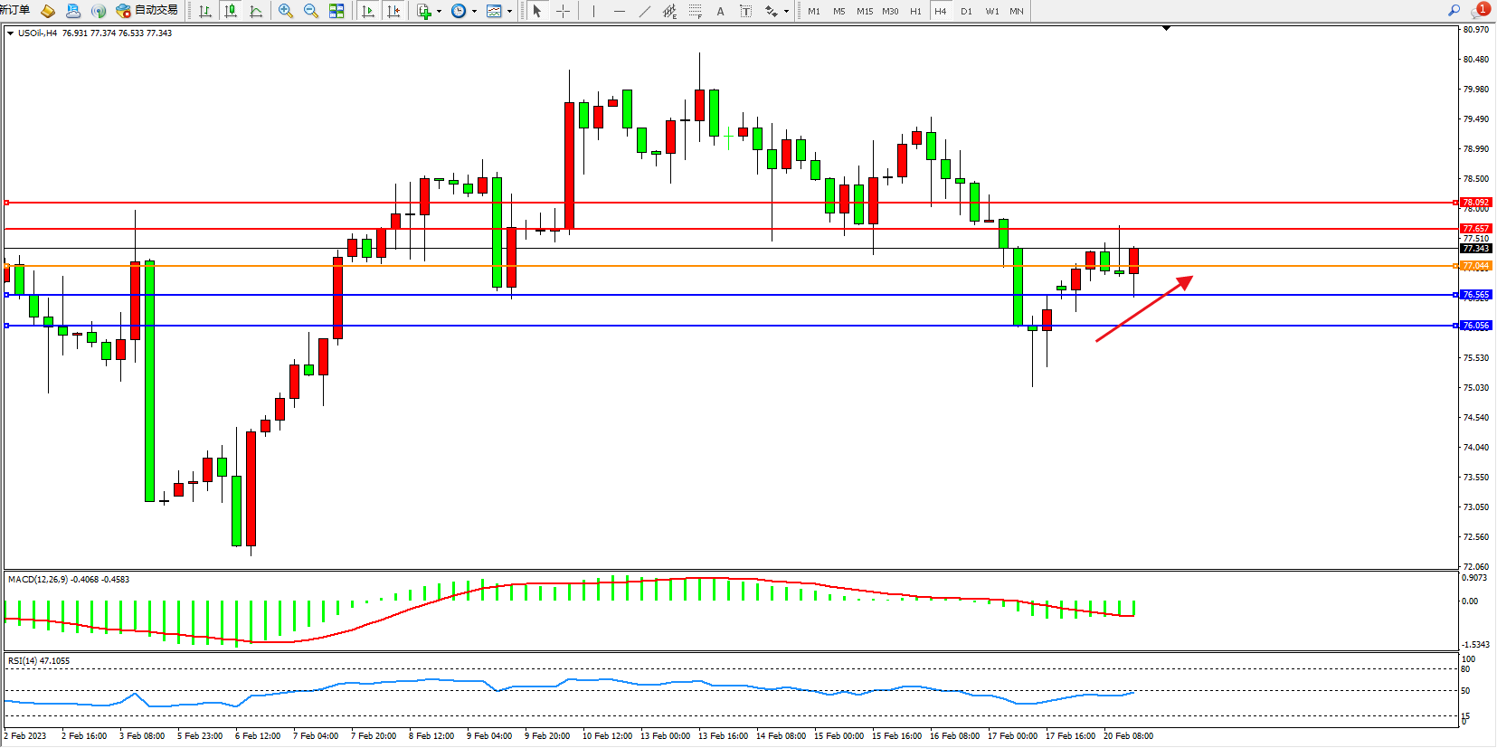 交易策略:77.044上方看涨,目标77.657、78.092